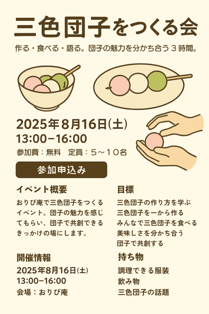 働きながら、食べて、語って、みんなで三色団子の魅力を再発見する素敵な3時間。はじめての方も大歓迎です!ぜひご参加ください。